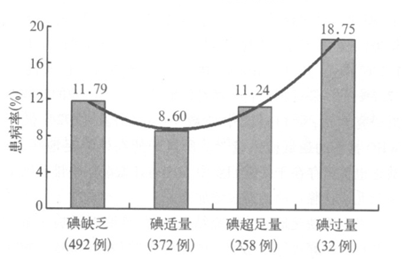 結(jié)論: 孕早期碘缺乏可以導(dǎo)致母體亞臨床甲減患病率增加,碘超足量和碘過量可以導(dǎo)致母體亞臨床甲減患病率和低T4血癥的增加。