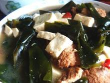 原料:豆腐一塊、海帶半斤、清湯一碗.精鹽、蔥姜麻油各適量