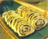 把豬肉韭菜餡抹在蛋皮上,放一張紫菜,再放一層豬肉韭菜餡抹平。將兩側(cè)向里折一個(gè)小邊,再?gòu)膬深^向中間卷起,至中間合攏,用凈紗布扎好,制成一個(gè)蛋卷,入蒸鍋里隔水蒸約30分鐘至熟透;將紫菜蛋卷切成小段入盤即可。